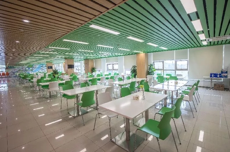 整个食堂占地面积1800平方米,提供早、中、晚三餐;整体配色选用了通联支付logo色“橙、黄、蓝、绿”四种颜色,活泼中带点俏皮,身处其中,让人不禁心情愉悦。600个餐位,哪怕用餐高峰,也可从容就餐。