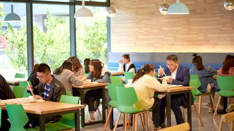 中膳打造园区、写字楼的食堂时,改变传统食堂布局,同时设立四人位、多人圆桌和吧台的设计,保证了高峰期时人们的用餐需求,实现了场景体验与品质的全面升级。餐厅风格简约时尚,注重空间体验的优化,提高人们就餐的幸福感,让大家感受到吃饭也是一种享受和休息。