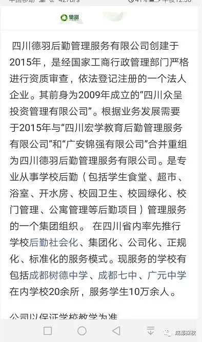 被发现后,学校食堂疑似连夜转移证据,被家长们围堵在学校门口。据了解,七中实验的食堂并非学校经营,而是外包给的了一家名为德羽后勤的公司。小编通过查询发现,这家公司全名为四川德羽后勤服务管理有限公司,在其官网上明确写到,现在服务于成都树德中学、成都七中、广元中学等20余所学校,覆盖10万学生。