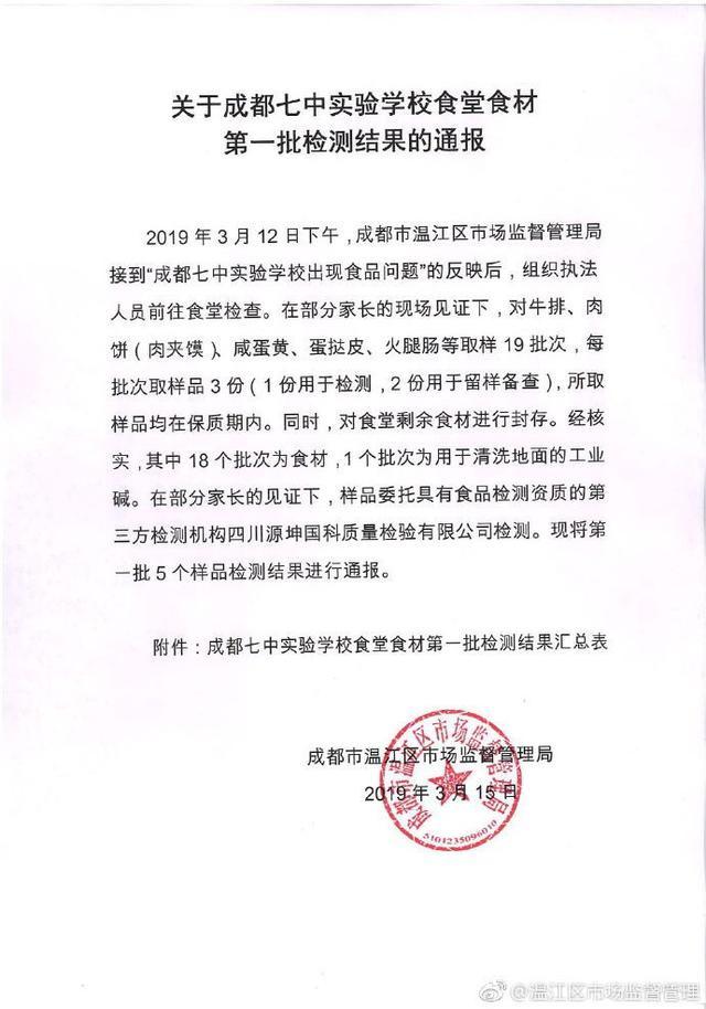据通报,2019年3月12日下午,成都市温江区市场监督管理局接到“成都七中实验学校出现食品问题”的反映后,组织执法人员前往食堂检查。在部分家长的现场见证下,对牛排、肉饼(肉夹馍)、咸蛋黄、蛋挞皮、火腿肠等取样19批次,每批次取样品3份(1份用于检测,2份用于留样备查),所取样品均在保质期内。同时,对食堂剩余食材进行封存。经核实,其中18个批次为食材,1个批次为用于清洗地面的工业碱。在部分家长的见证下,样品委托具有食品检测资质的第三方检测机构四川源坤国科质量检验有限公司检测。现将第一批5个样品检测结果进行通报。