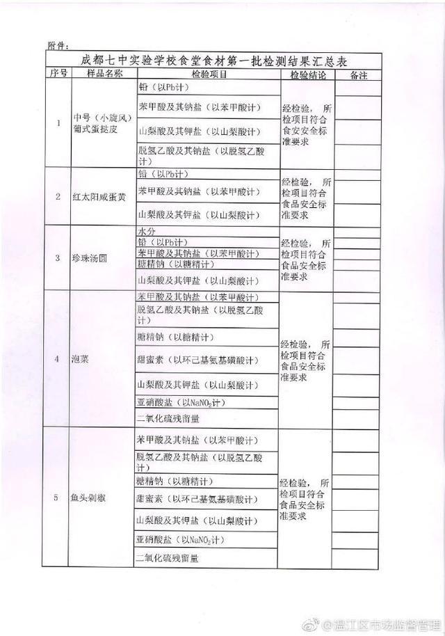 四川发布客户端消息 今天下午,温江区市场监督管理局官微@温江区市场监督管理 发布关于成都七中实验学校食堂食材第一批检测结果的通报。通报中表示,所取样品均在保质期内。