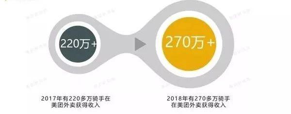 此外,外卖也拉动就业,某一方面解决了就业难题。以外卖为例,2018年共有270多万骑手在美团外卖获得收入,比2017年增加了近50万。其中,有67万骑手来自贫困县,覆盖了全国94%的贫困县。