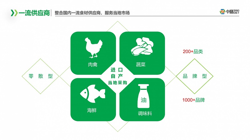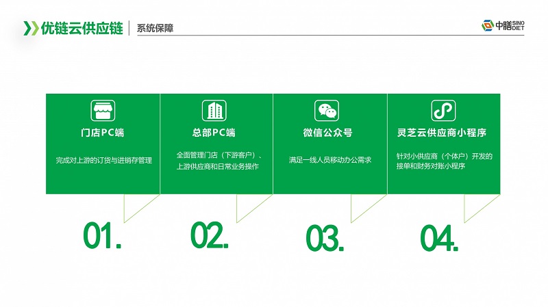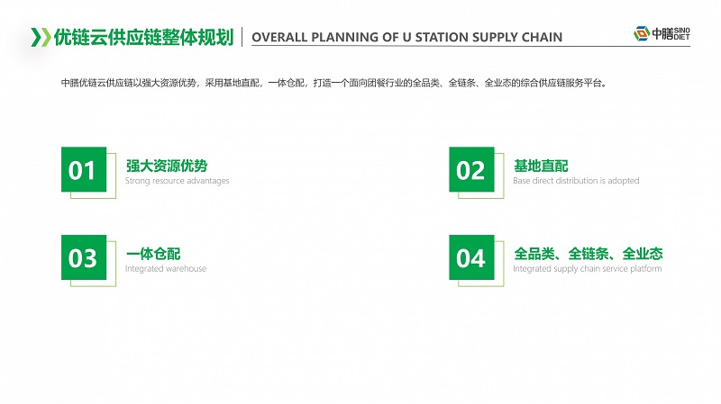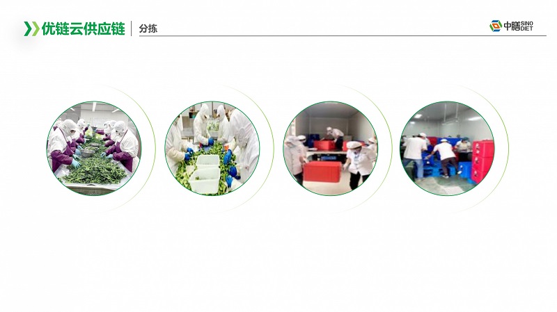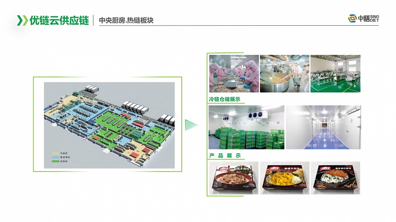 中膳优链云供应链以强大的资源优势,采用基地直配,一体仓配,打造一个面向团餐行业的全品类、全链条、全业态的综合供应链服务平台。